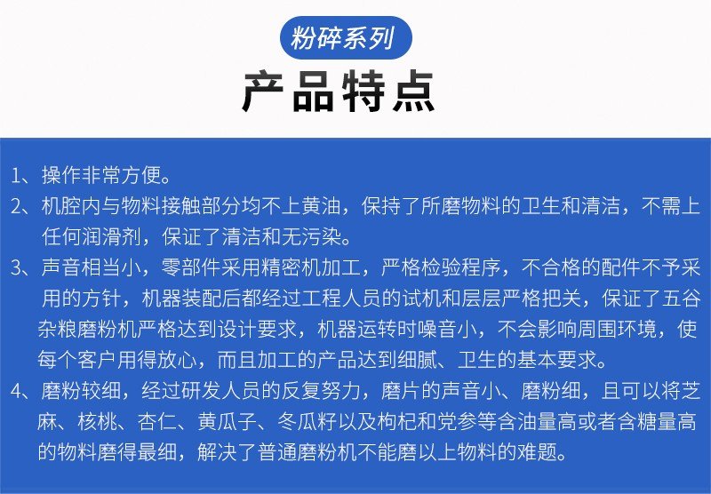 小型磨粉机也叫五谷杂粮磨粉机,是将各种粮食、中药材等食物研磨成50~200目的均匀粉末的一种机器。机器采用优质不锈钢制作,运用精加工技术打造而成。磨粉机靠两块布满齿槽的磨盘对磨运转从而将物料研磨成粉末状,能将各种五谷杂粮、中药材、调味品原料等物料研磨成50-200目的均匀粉末。