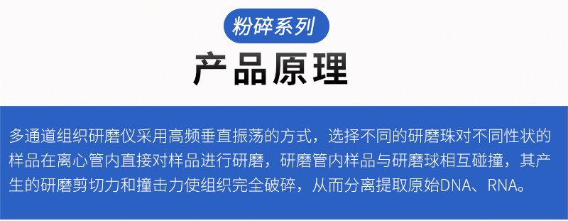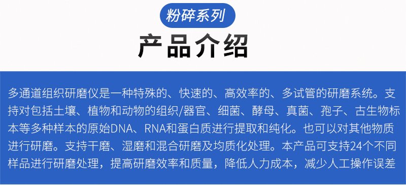 介绍:多通道组织研磨仪是一种特殊的、快速的、高效率的、多试管的研磨系统。支持对包括土壤、植物和动物的组织/器官、细菌、酵母、真菌、孢子、古生物标本等多种样本的原始DNA、RNA和蛋白质进行提取和纯化。也可以对其他物质进行研磨。支持干磨、湿磨和混合研磨及均质化处理。本产品可支持24个不同样品进行研磨处理,提高研磨效率和质量,降低人力成本,减少人工操作误差。