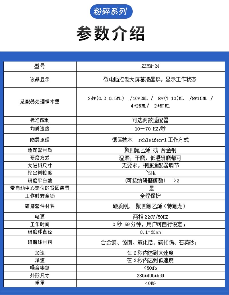 根据湖南粉体装备官方产品资料显示:多通道组织研磨仪的粉碎程度为其他,产量为24*(0.2-0.5ML) /16*2ML / 8*(7-10)ML /8*15ML / 4*25ML/ 2*50ML24*(0.2-0.5ML) /16*2ML / 8*(7-10)ML /8*15ML / 4*25ML/ 2*50ML,装机功率(kw)为0.4,成品细度为~5µm,入料粒度(mm)为≦3,工作原理为其他,多通道组织研磨仪的价格为14200元,具体型号是ZZYM-24,品牌为粉体装备研究院。